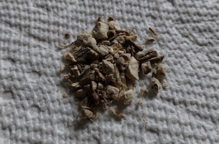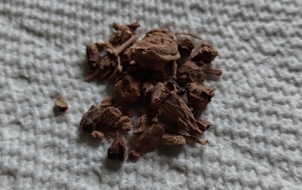 Last but not least, I put in a bit of marshmallow root. Marshmallow (unrelated to the fluffy, sugary sweet you roast over the campfire) has a slightly demulcent (slimy) texture that coats and soothes irritated tissues. Since I was coughing a lot my throat was getting pretty raw, and I thought a bit of marshmallow would feel good.